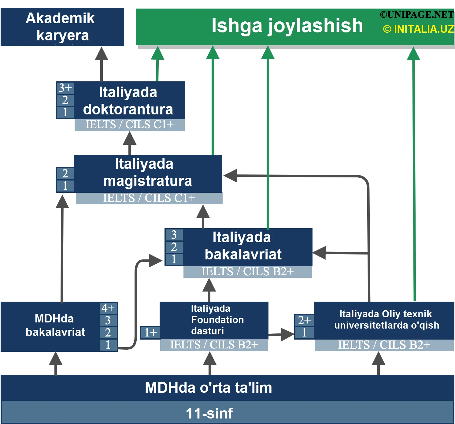 - Talablar. Italyan universitetlari bakalavriatga 11 yillik umumiy ta'limni tamomlagan abituriyentni qabul qilishmaydi, negaki bakalavriat uchun asosiy talab - 12 yillik ta'lim dasturini tugatgan bo'lish. 11 yil o'qigan abituriyent yoki o'z mamlakatida topshirmoqchi bo'lgan yo'nalishining 1 kursida o'qishi kerak yoki Italiya universiteti qoshidagi Foundationni o'tashi kerak.